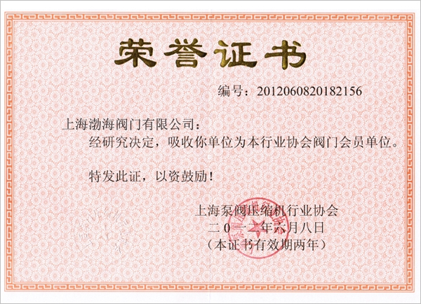 上海泵阀压缩机行业协会荣誉证书